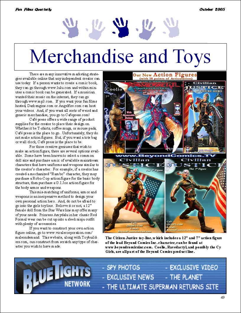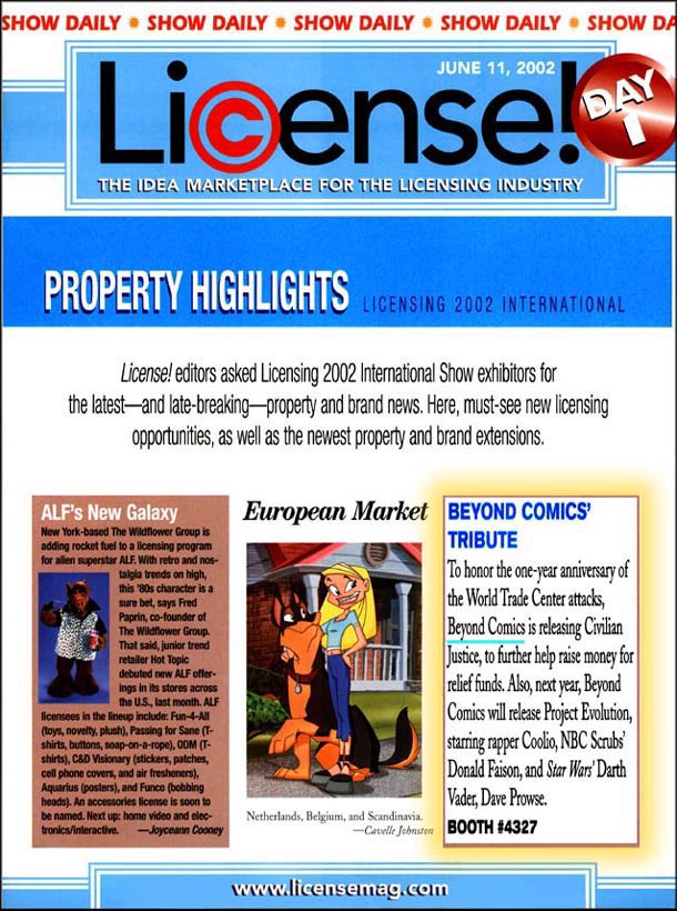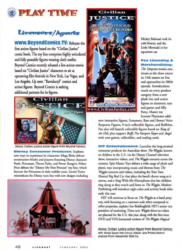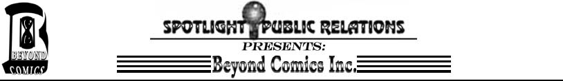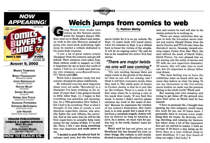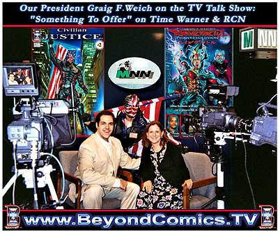 Museum's Golden Panel Award for Excellence, Stan Lee was also Won) Comic Book Museum's Golden Panel Award "CBG"(Comic Book Buyer's Guide, issue #1499 on page 16) License Magazine (Cover) License Magazine (Write-Up) www.Mawopi.com (Comics & Ent. Magazine's Write-Up & interview of Mr.Weich & Beyond Comics). www.BlueTights.com (Scroll Down for release of Graig in both Spider-Man films)http://www.bluetights.net/theplanet/showthread.php?t=18065 ----------------------------------*Look for our Write-ups & Reviews on*:--------------------------------------- 20/20 ABC, ABC NEWS.com, FOX SPORTS NET on MSG NETWORK & in: "ABC News 20/20" , "FOX TV's Buried Treasure" , "AMC & Kevin Smith's TV Show: TheSecret Stash with Jay and Silent Bob" "Time Warner's" TV Talk Show: "Something to Offer" & "Smudge" "Wizard" Magazine Issue #132 (on page 119 & poster on page 61) & the Exclusive Civilian Justice trading card in Wizard #133. We are also in the current issue of "Wizard" issue #150 (on page: 139). (first released: Aug-1-2002, Sept-1-2002 & Feb-2004 (March cover) As well as our Huge Write-up in "CBG"(Comic Book Buyer's Guide, issue #1499 on page 16), the 6 page write-up on Beyond Comics & Civilian Justice in "Kit Builder's" Magazine, issue # 41, with a 9 page write-up in "Comics Journal" Magazine #247(page 9-17), License Magazine (F 5,#2) & on www.Mania.com (Comics 2 Film) with even more write-ups on the way! "Beyond Starlight" The new U.K. Comic Con site by Francis Lee (Scroll down to see pic of Graig of Beyond Comics). _______________________________________________________________________________________ For more info contact: Toni Selverne, rep for: