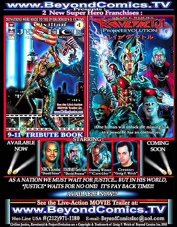 Graig appearing at Comic Con Signings soon (Scroll Down below): *Our 2 ANIMATED & VideoGame* ANIME-MANGA Cartoon MOVIE: Click the link to see our 2 upcoming Anime/ Animated Cartoon Movies from the same company that worked on Mortal Kombat, Click Here: http://www.beyondcomicsinc.com/rave3-d.html _____________________________________________________________________ *Our Anime/Manga Poster*: www.beyondcomicsinc.com/cjanime.html ..... http://www.beyondcomicsinc.com/video/cj-anime.mov __________________________________________________http://www.beyondcomicsinc.com/video/rave-anime-spin.mov *Our ACTION FIGURES* Look for the launch of our New Action-Figure Toys based on our comic books, sculpted by former Spawn (Todd Mcfarlane Toys) & Dragon Ball-Z Sculptors, premiering 4th quarter.Click here: www.beyondcomicsinc.com/cjfigs.html www.Action-Figure.com - Our huge TOY Write-Ups & Review for our upcoming Action Figures. __________________Super Heroes team up with Civilian Justice to do Battle! Our TV Commercials will begin airing on Cartoon Network, the new Howard Stern Show, Dragon Ball Z & South Park just to start. ______________________________________________________________________________________ *Our 2 AWARD WINNING Movies Previews* Click these 2 links below to see our 2 NEW Award Winning 4 minute previews based on our award winning comics & upcoming Animated series & action figures that the Celebrities star in: -____Ravedactyl: www.beyondcomicsinc.com/ravevid.html Civilian Justice: www.beyondcomicsinc.com/usamovie.html ________________________________________________________________________ *Our Mini Movie Previews* Click the link below (to see a new 20 second preview clip of our Promo-Movies). www.beyondcomicsinc.com/video/cjrademo.mov (Quicktime Movie Player is needed to view & it wont play in Media Player). Download it FREE at: www.apple.com/quicktime/download/ See the World Premiere NOW of: these 2 NEW Celebrity Comic Book-SuperHero Live Action Movie trailers for the first time at: www.BeyondComics.TV ___________________________________________________________________________ Creator, Graig F.Weich: "Over 60 years ago in the world of comics, our grandparents had Captain America to fight a real threat in the unfortunate war of their time, and Now, some 60 years later, our generation will have their new hero to fight the real theats we face today and to fight for peace and unity against evil villains of all kinds! A character created to help people vent their rage & frustration in a safe forum such as a comic book, a Hero that will help us to no longer feel hopeless, but hopeful! My new character: Civilian Justice, does Not represent any one Presidential candidate or Government, for his loyalty is to the people. He is "our" hero, he is us, the civilians! I wanted to create a New Superhero that fights real villains in the real world, instead of pretend villains in a fantasy world & at the same time demonstrate to the youth that they must not be fearful, for even though villains can be of any nationality, they are merely cowardly-monsters hiding in human faces, who are using the name of innocent, peaceful beliefs to hide behind for their own gain."… "As a nation, we must wait for justice, but in his world, Justice waits for no one!" In the upcoming sequel, my hero; Civilian Justice, will become; "Code Name: Justice", and go after the corrupt politicians in our country as well as abroad and continue to stop injustice wherever it lies. He will also form a Global international team of Heroes around the world, to defend us all, for he does Not attack... he defends!" Weich's Civilian Justice comic book from our very own Beyond Comics, has just been inducted into the Historical Society of America's Popular Cultural Authentic History Center: 1- www.authentichistory.com , 2- www.authentichistory.com & 3- www.authentichistory.com (Scroll Down) To Honor the memory of the victims from the WTC Attacks, President of : www.BeyondComics.TV , Graig F. Weich, a fifth generation New Yorker himself, donated the first year's proceeds from his Comic Book; Civilian Justice, to help raise money for the families of the forgotten Victims who were Over-looked and left out of the relief funds. They are not forgotten anymore. Weich, donated his award winning comic book & did an in-person Signing for the children & families of the over-looked victims from the WTC Attacks at Planet Hollywood and donated the first years proceeds of the book to them as well. Weich said: "Meeting the children that we tried to help & seeing the smiles on their faces when they held my comic book in their hands, is why I did this & is what Civilian Justice is all about, a hero to bring hope and peace of mind." Click here to see a pix: www.beyondcomicsinc.com/images/... ______________________________________________________________________ Look for www.BeyondComics.TV 's other upcoming Comic Book/Movie releases coming soon, titled: RAVEDACTYL: Life Beyond Death. "One Human will unlock the missing link to our existence & to a power he has no control over... Then a new Hero will emerge for a New Millennium... _in a war that will forever be known as: *RAVEDACTYL* *RAVEDACTYL*:(Project:Evolution) Stars: -From Clueless & TV’s NBC's "SCRUBS" : *Donald Faison*, -From the new Ben Affleck Movie: "DareDevil" Grammy Award Winning Rapper: *Coolio*, -From "STARWARS", the man behind the mask of *Darth Vader*: David Prowse. -With a Cameo in "Spider-Man 3 & 1" the Movies, creator: Graig F. Weich. -And with Fight Choreography from the Stunt Team from "Spider-Man"... ...comes two new superhero comic book & live action Movie/ TV projects: Code Name: Justice & next, Ravedactyl, from Beyond Comics Inc.! __________________________________________________________________________________________________________ As you may know, the average comic book sells 25,000 units a month, but we sold out of distributing over 300,000 units, thanks to the help of Wizard Magaz
